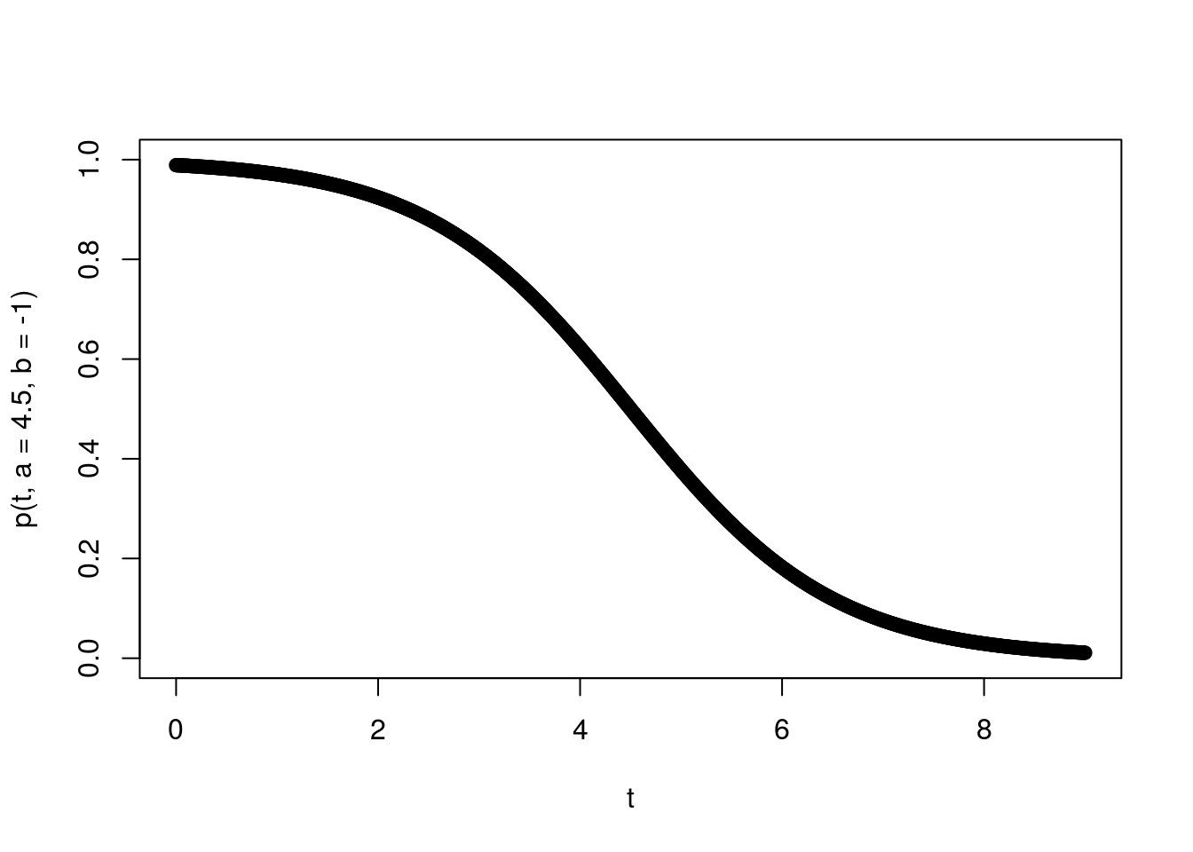 p<-function(t,a=4.5,b=-1){return(1/(1+exp(-b*(t-a))))}
