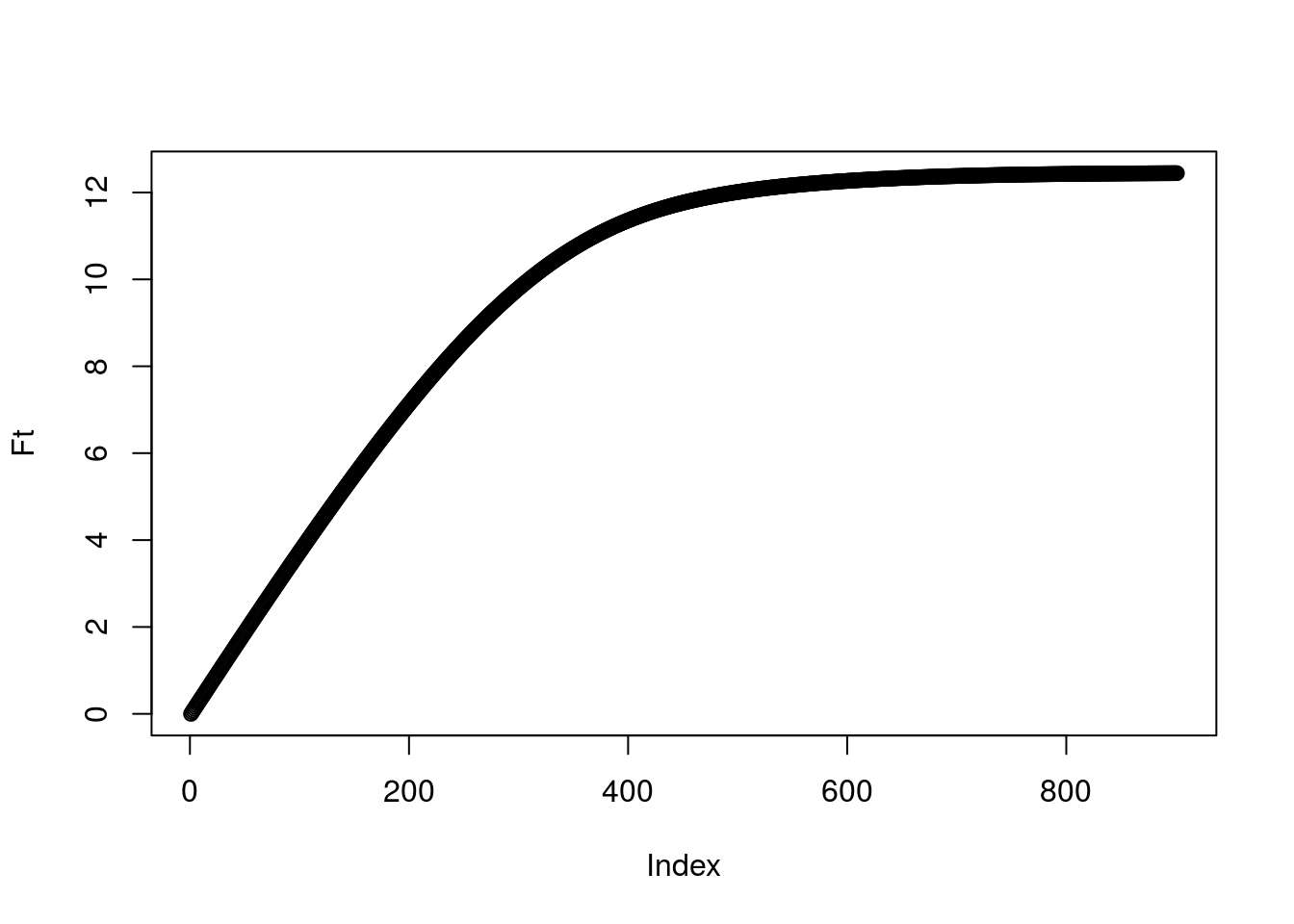 So what is the total amount of pollen in the hive? We’d guess the total amount might plateau through time. To calculate the amount, call it \(F(t)\), we can do some basic accounting to write it as \[F(t)=\sum_{i=1}^K iN_i(t)\]. Let’s just look at this based on the results of our expectation: