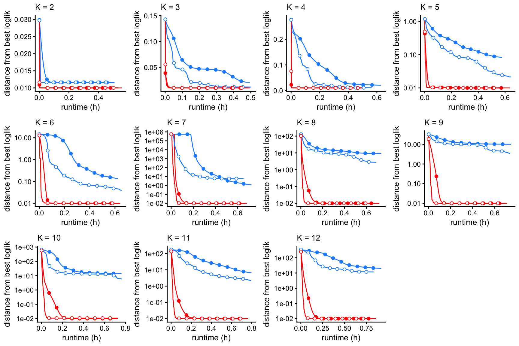 The next set of plots shows the improvement in the fit over time, for \(K\) from 2 to 12, using EM or SCD, with and without extrapolation. The quality of the fit is measured by the log-likelihood relative to the best log-likelihood that was identified among all methods compared.