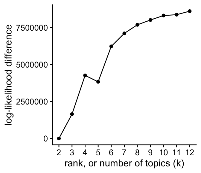 This plot shows the improvement in the log-likelihood as the rank, \(K\), is increased. The log-likelihoods are shown relative to the log-likelihood at \(K = 2\).