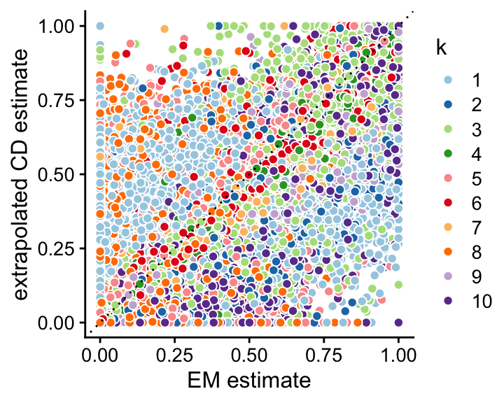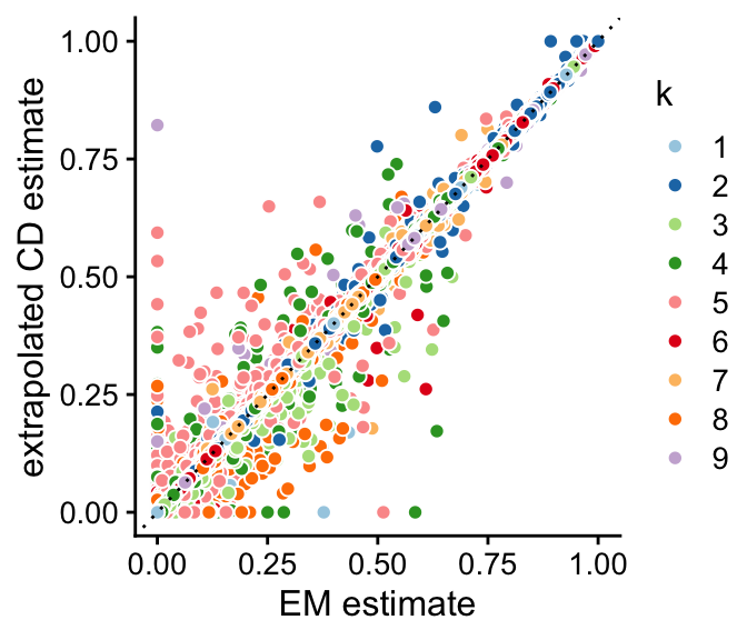 labs(x = "EM estimate",y = "extrapolated CD estimate") +