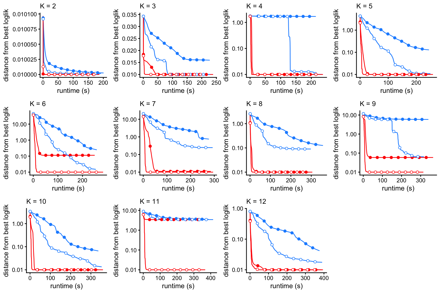 The next set of plots shows the improvement in the fit over time, for \(K\) from 2 to 12, using EM or SCD, with and without extrapolation. The quality of the fit is measured by the log-likelihood relative to the best log-likelihood that was identified among all methods compared.