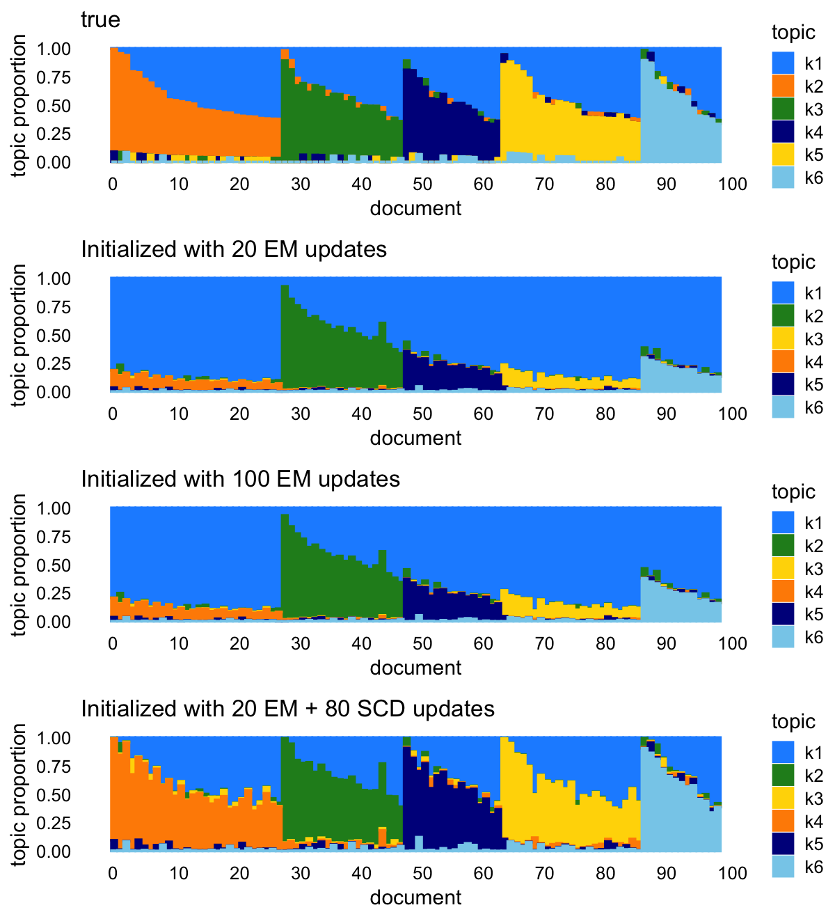We fit the multinomial topic model by performing 80 EM updates or 80 SCD updates. Both of the fits were first initialized by running 20 EM updates.