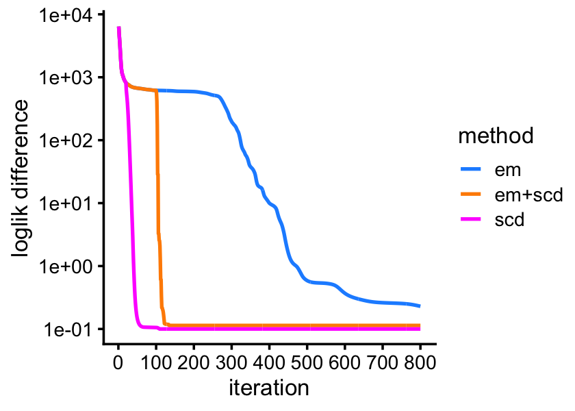 Returning to the maximum-likelihood estimation problem, it is reassuring is that if we continue to perform the EM updates, they eventually arrive at the same solution as SCD. But SCD is able to “rescue” the EM estimates much more quickly after performing just a few SCD updates: