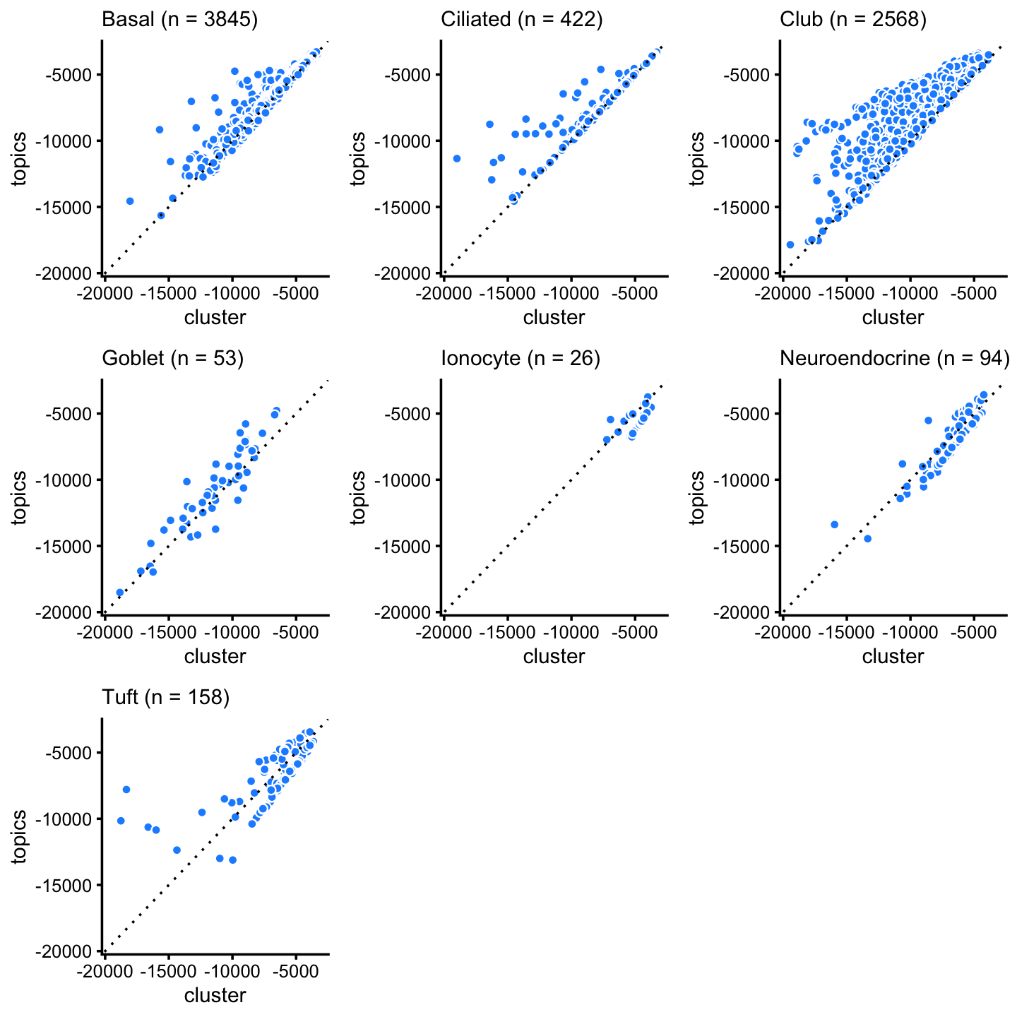 Next, we compare the topic-model likelihoods to the clustering-based likelihoods. In most cases, the topic model provides a fit that is better or at least as good as the clustering-based fit. The exceptions are the less abundant tuft, neuroendocrine and ionocyte cell types.