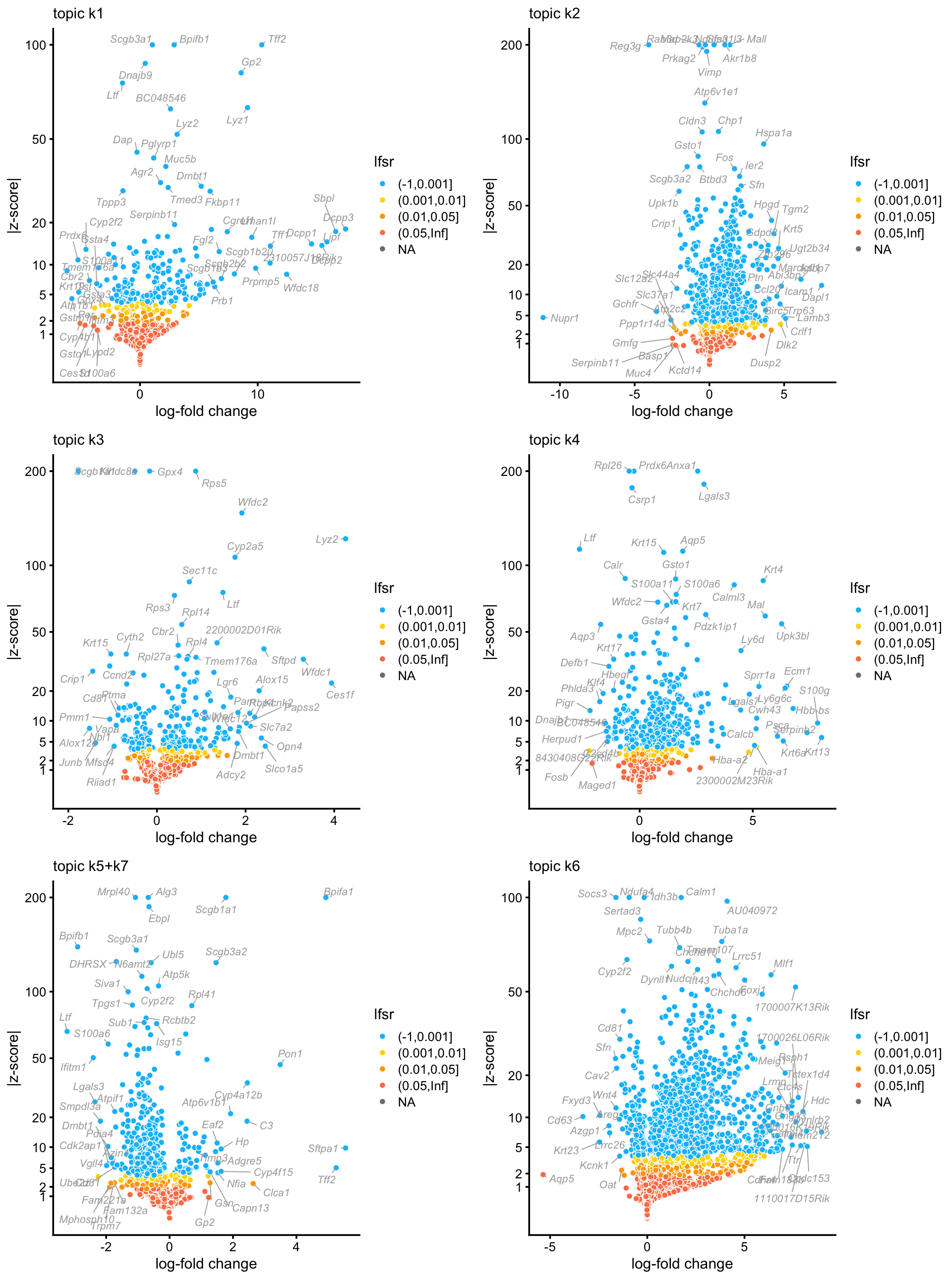 Judging by the most overexpressed genes in these volcano plots, the topics capture goblet cells (topic 1), basal cells (topic 2), “hillock” club cells (topic 4), ciliated, tuft and neuroendocrine cells (topic 6), and club cells (topics 5 + 7).