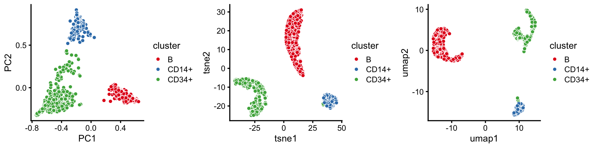 To begin, draw a random subset of 2,000 cells from the B, CD14+ and CD34+ clusters identified above. (The main reason for taking a random subset is that we don’t want to wait a long time for t-SNE and UMAP to complete.)