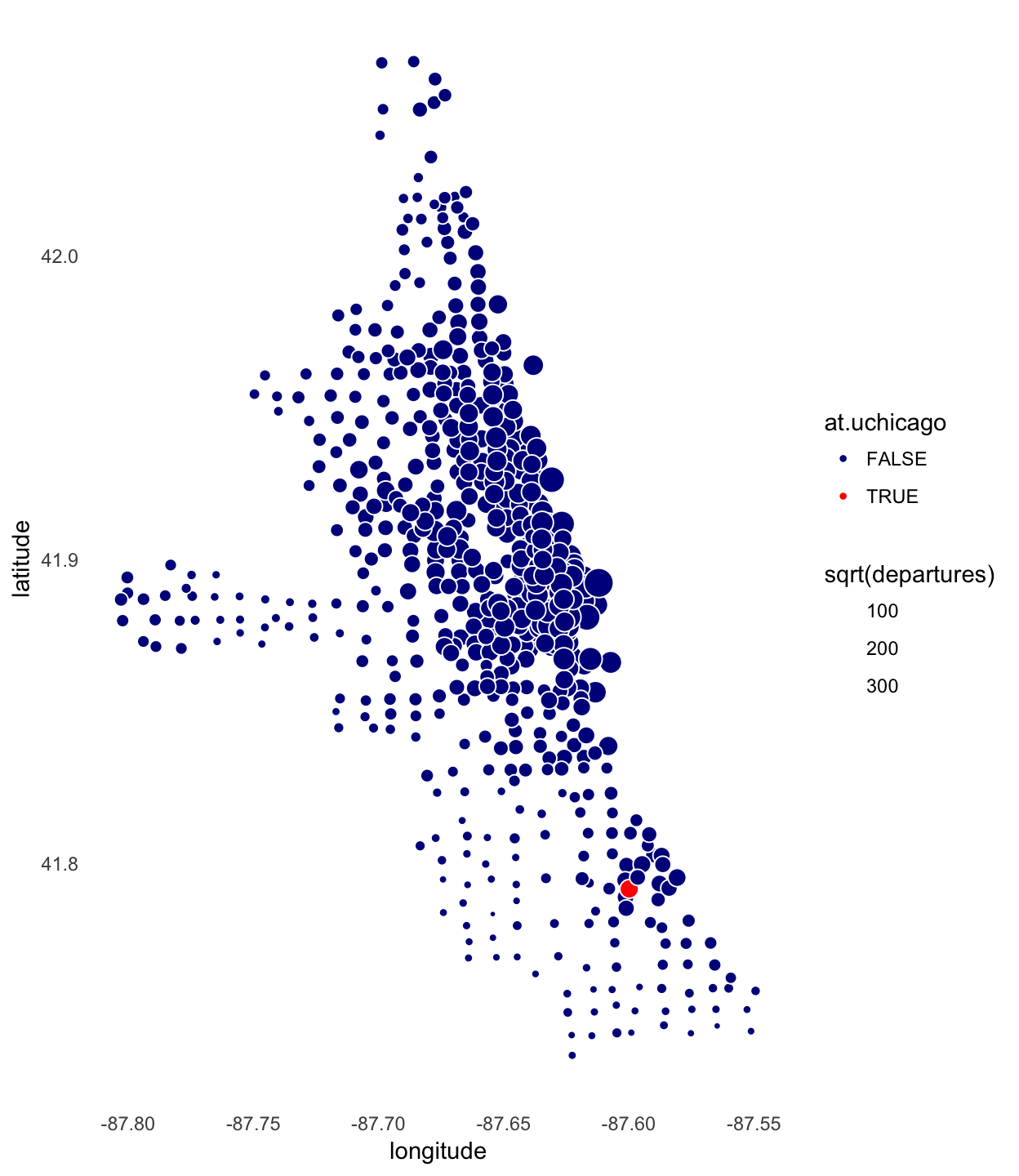 A plot of the Divvy stations by geographic location (latitude and longitude) traces the outlines of the City of Chicago and the Lake Michigan shore. Further, the location of the downtown is apparent by scaling the area of each circle by the number of trips.