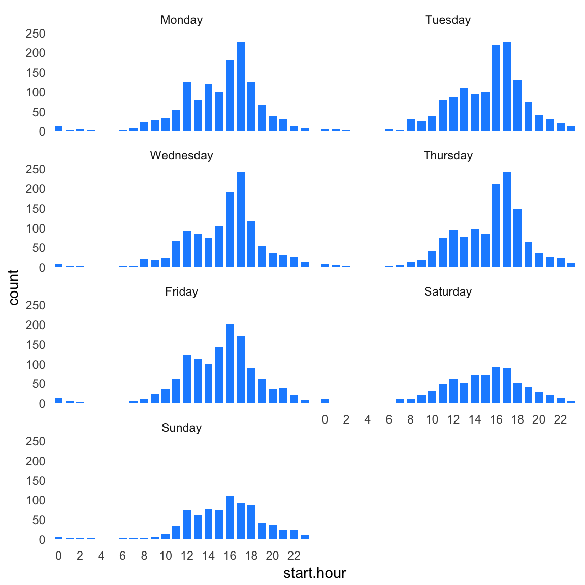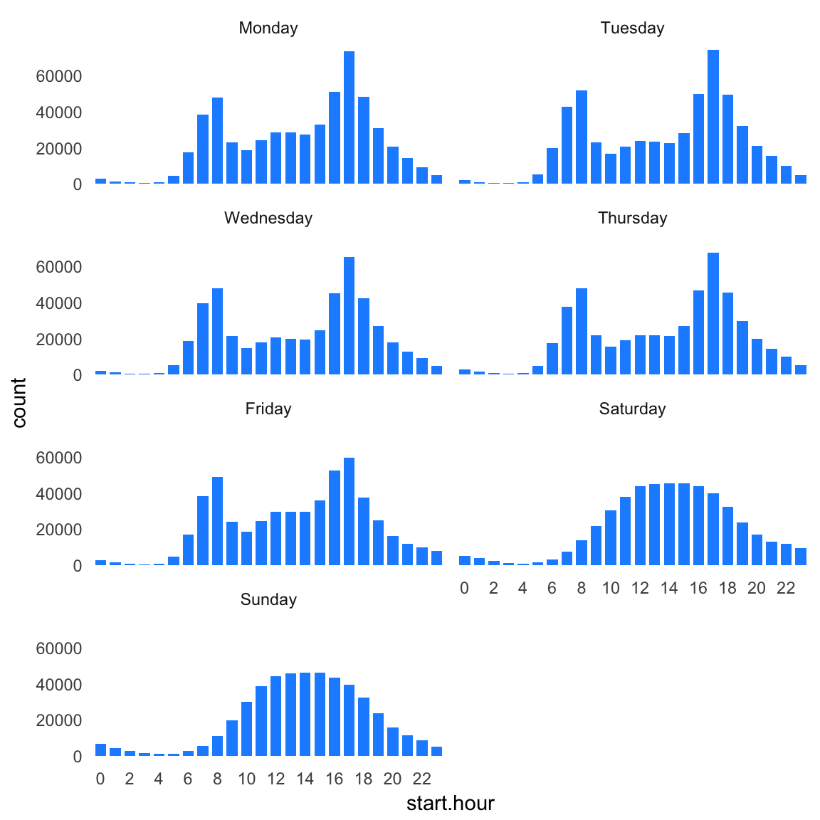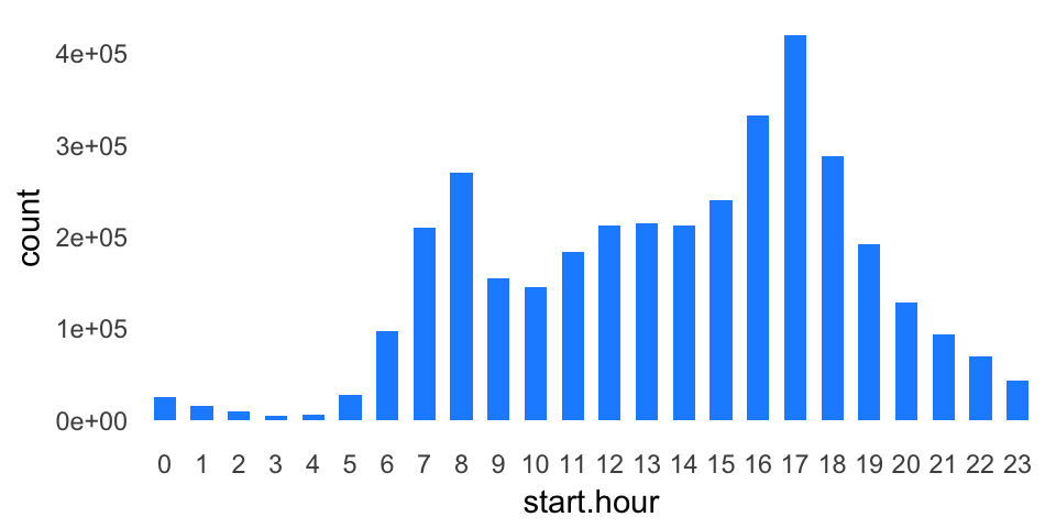 Now that start.hour is a factor, it is easy to create a bar chart showing the total number of departures at each hour. Unsurprisingly, we see little biking activity at night. Further, the two peaks (“modes”) in the bar chart nicely recapitulate the morning and afternoon rush hours.