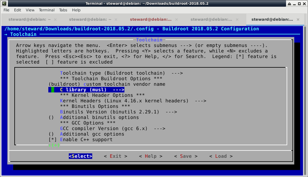$ cd $ wget https://buildroot.org/downloads/buildroot-2018.05.2.tar.gz $ tar vxf buildroot-2018.05.2.tar.gz $ cd buildroot-2018.05.2 $ make menuconfig