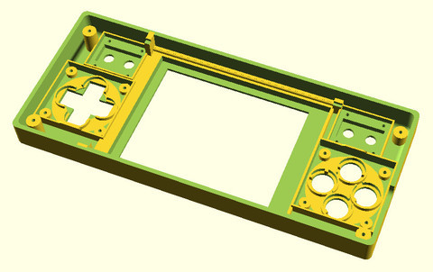 基本上,司徒要感謝GameShell官方贈送這台開發測試機,讓司徒可以盡情發揮破壞的能力,而司徒打算從外殼改造開始著手,理由很簡單,因為官方設計的外殼根本無法拿來當作掌機遊玩,最基本的DPad都設計的一塌糊塗,更何況四顆ABXY按鈕,L、R按鍵就別想了,因此司徒決定設計一個經典的外殼,而眾所皆知的經典掌機就是丁果A320掌機,所以外形基本上是參考丁果A320外觀,搭配使用的軟體則是:OpenSCAD和KiCAD這兩套開源軟體,而使用的DPad、ABXY以及SS按鈕,則是依據NDSL掌機的尺寸做設計,司徒希望這樣的設計,除了可以延續丁果A320掌機的經典外殼,更可以融合NDSL的好手感,實為一石二鳥之計!