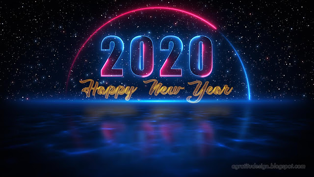 Happy New Year 2020 Lettering With Gold And Neon Light Style Against Orange Blue Dark Starry Sky Background