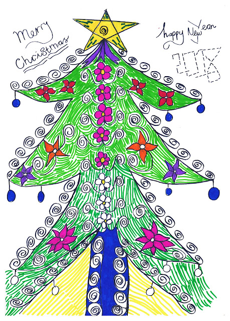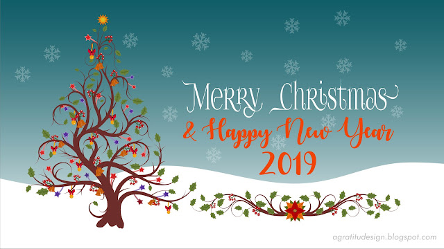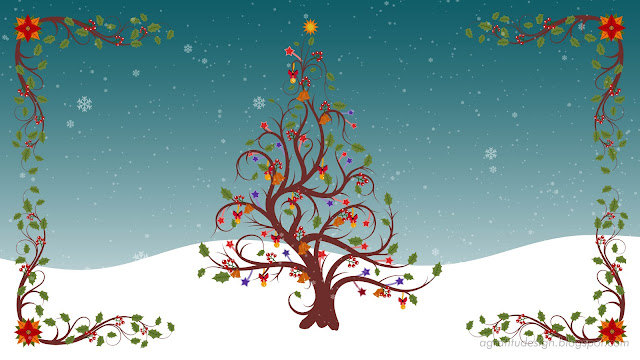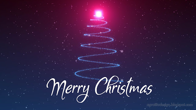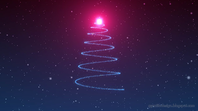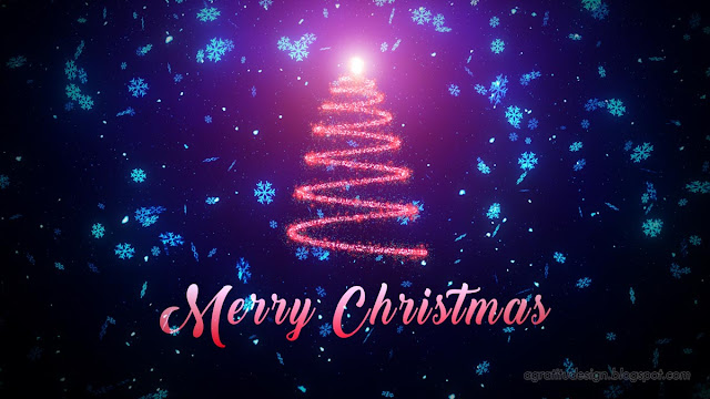 Red Shining Merry Christmas Greeting With Abstract Christmas Tree Sparkle Glitter Light Path Against Blue Shines Snowflakes Falling Blowing In Wind