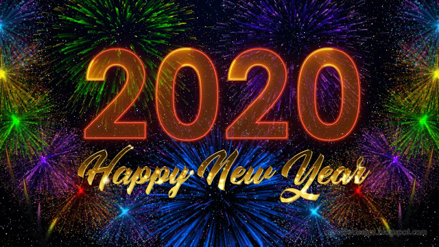 Wonderful Happy New Year 2020 Gold Shines And Neon Light Greeting With Attractive Fireworks Explosion On Dark Starry Night Sky