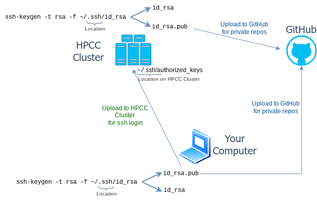Fig 1: SSH Keys required to work with private GitHub repos from a local computer as well as a remote system like the HPCC Cluster. The figure also includes the SSH Key required for password-less login to the remote system (here HPCC cluster). For generating SSH keys, see here.