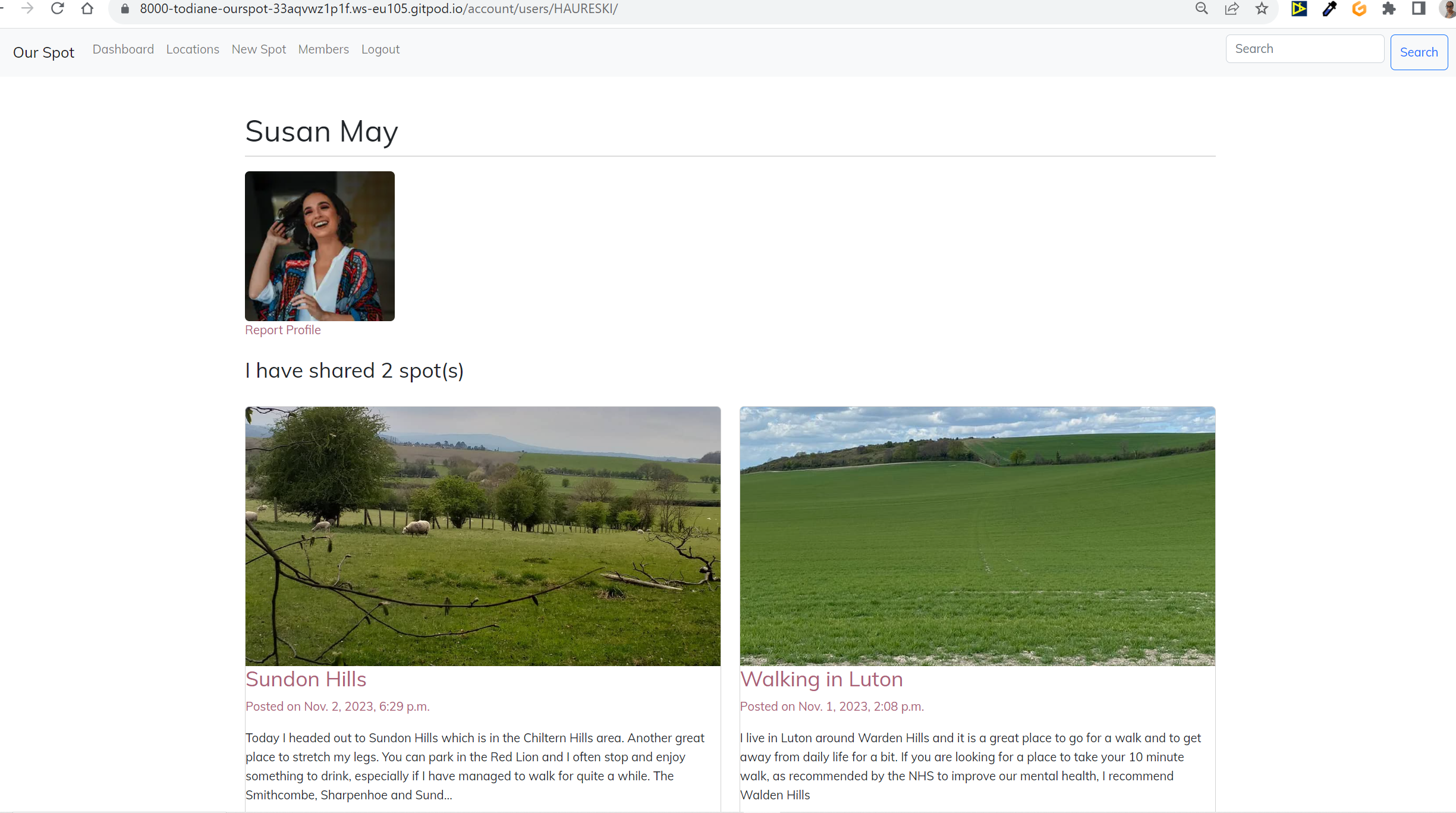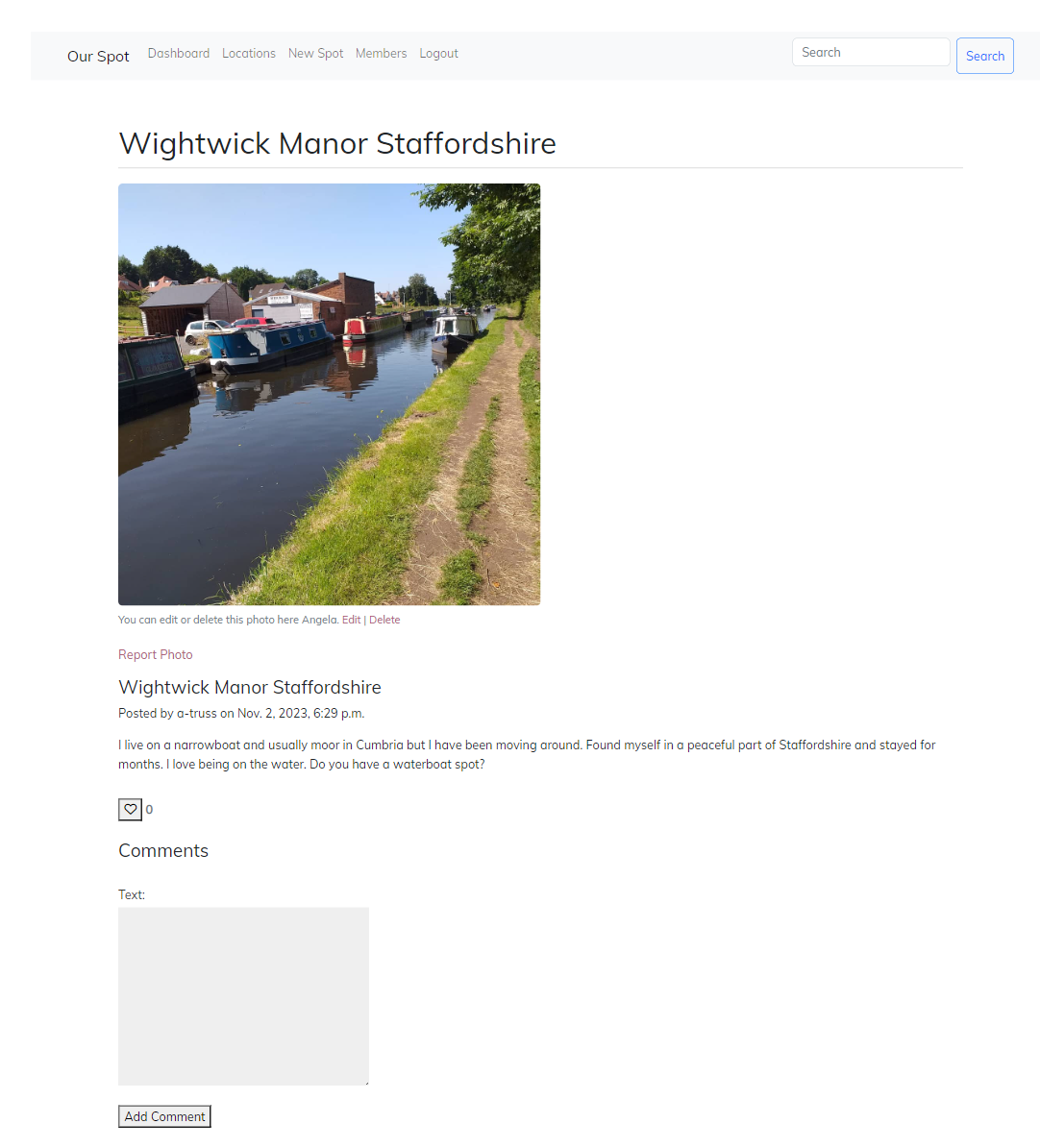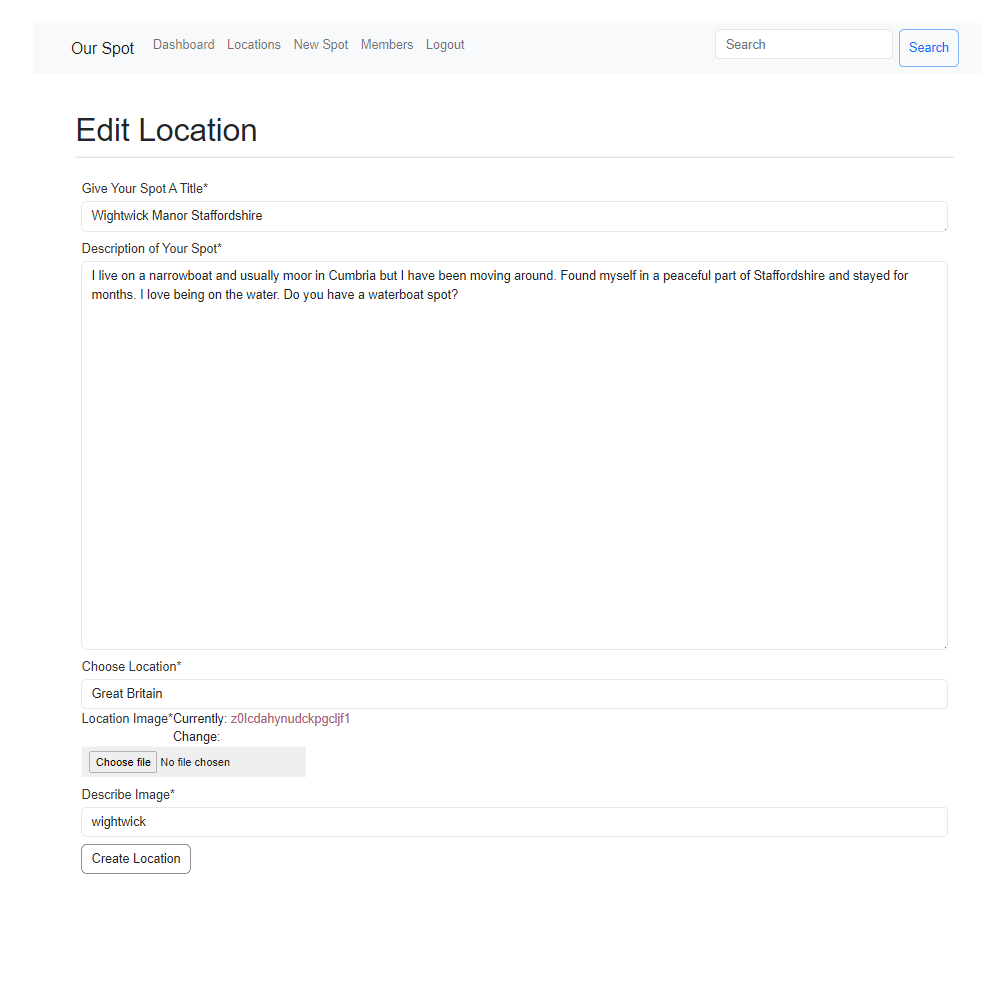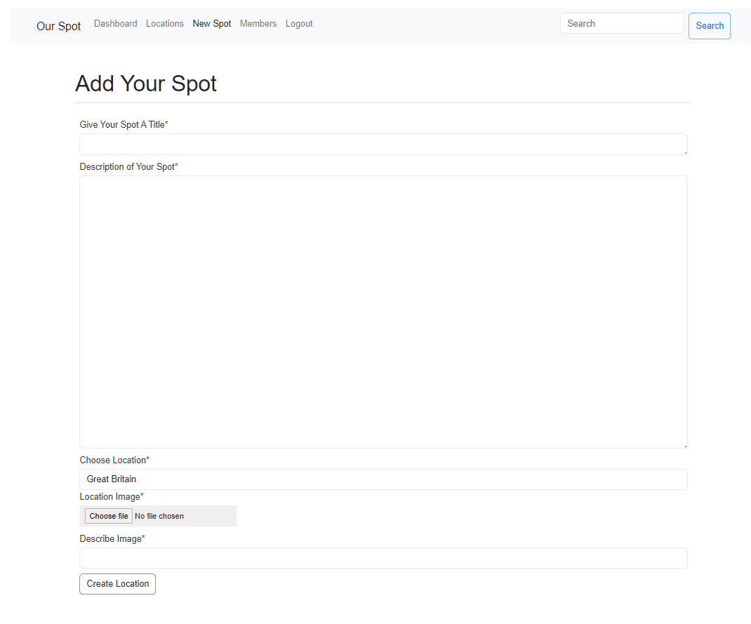 Our Spot is a web application made using Django. It's main aim is to provide a space where people can go to share their favourite places around the world. As well as sharing photos, the site will also provide an opportunity to connect with other members and foster friendships.