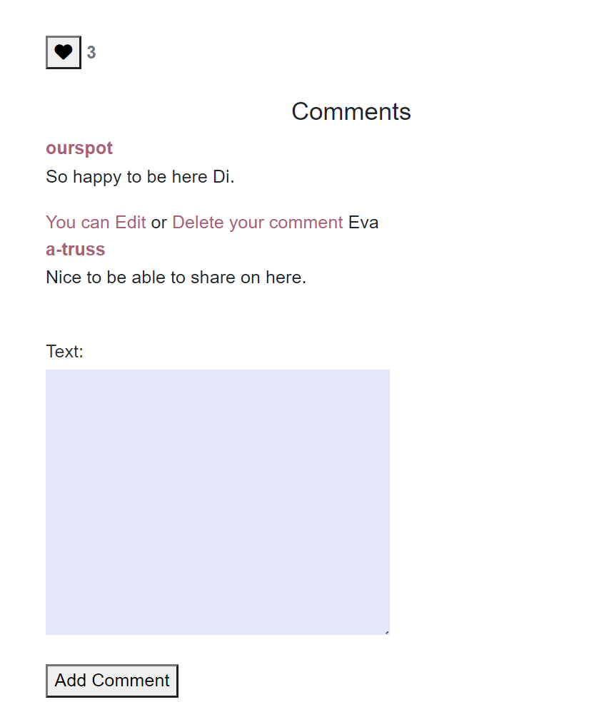 - [Slackoverflow forum](https://stackoverflow.com/questions/2315187/allowing-users-to-delete-their-own-comments-in-django) for answers when stuck.