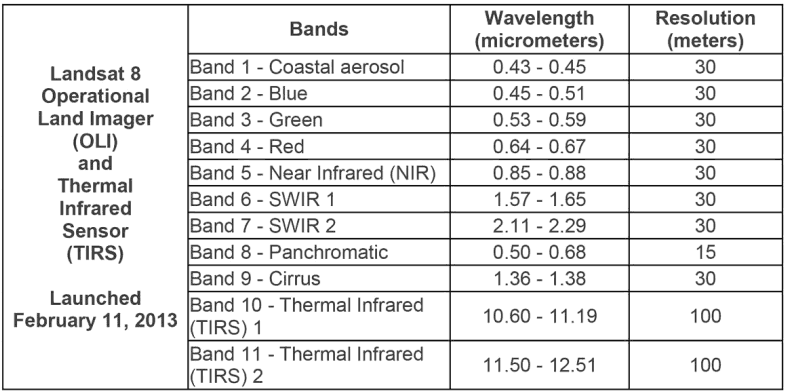 We can tell from the values that Landsat pixel values are 16-bit (0..65536). Remind ourselves of the band combinations for Landsat 8: