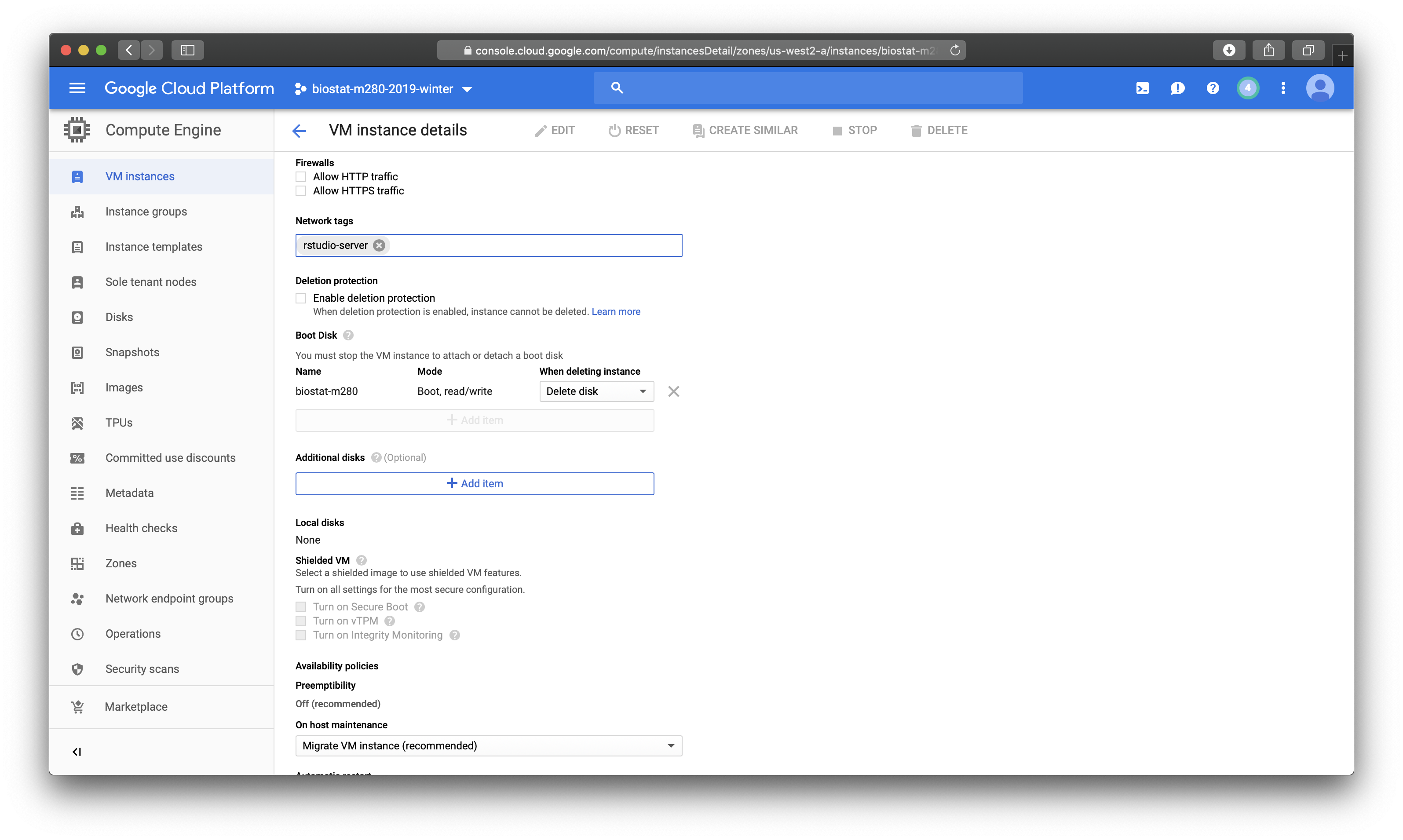 - By default, port 8787 used by R Studio Server is blocked by VM firewall. On GCP console, go to `VPC network` and then `Firewall rules`, create a rule for R Studio Server (tcp: 8787), apply that rule to your VM instance.