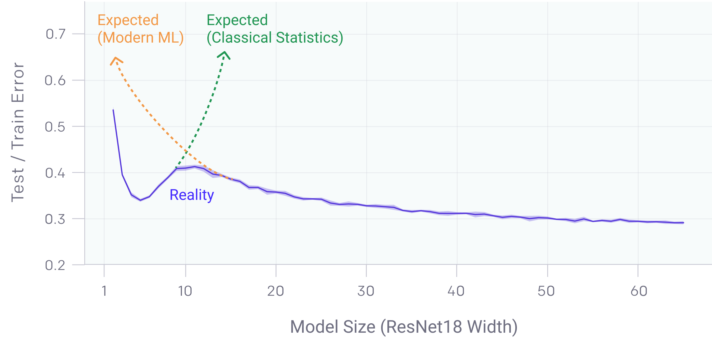 Bias-variance trade-off. ::: ## Classical regime vs modern regime - Above U-shaped test MSE curves are in the so-called **classical regime** where the number of features (or the degree of freedom) is less than the training samples. In the **modern regime**, where the number of features (or the degree of freedom) can be order of magnitude larger than the training samples (recall that ChatGPT3 model has 175 billion parameters!), the **double descent** phenomenon is observed and being actively studied. See - [paper](https://epubs.siam.org/doi/pdf/10.1137/20M1336072) - [Linear regression with minimum-norm interpolators](https://hastie.su.domains/Papers/21-AOS2133.pdf) - [Benign overfitting in linear regression](https://www.pnas.org/doi/10.1073/pnas.1907378117) - [Double descent: Where bigger models and more data hurt](https://openreview.net/forum?id=B1g5sA4twr) ::: {#fig-double-descent} {width=600px height=300px} Double descent phenomenon ([OpenAI Blog](https://openai.com/blog/deep-double-descent/)). ::: ## Classification problems - When the outcome $Y$ is discrete, for example, email is one of $\mathcal{C}=$\{`spam`, `ham`\} (`ham`=good email), handwritten digit is one of $\mathcal{C} = \{0,1,\ldots,9\}$. - Our goals are to - build a classifier $f(X)$ that assigns a class label from $\mathcal{C}$ to a future unlabeled observation $X$; - assess the uncertainty in each classification; - understand the roles of the different predictors among $X=(X_1,\ldots,X_p)$. - To evaluate the performance of classification algorithms, the **training error rate** is $$ \frac 1n \sum_{i=1}^n I(y_i \ne \hat y_i), $$ where $\hat y_i = \hat f(x_i)$ is the predicted class label for the $i$th observation using $\hat f$. - As in the regression setting, we are most interested in the **test error rate** associated with a set of test observations $$ \frac{1}{n_{\text{test}}} \sum_{i=1}^{n_{\text{test}}} I(y_i \ne \hat y_i). $$ - Suppose $\mathcal{C}=\{1,2,\ldots,K\}$, the **Bayes classifier** assigns a test observation with predictor vector $x_0$ to the class $j \in \mathcal{C}$ for which $$ \operatorname{Pr}(Y=j \mid X = x_0) $$ is largest. In a two-class problem $K=2$, the Bayes classifier assigns a test case to class 1 if $\operatorname{Pr}(Y=1 \mid X = x_0) > 0.5$, and to class 2 otherwise. - The Bayes classifier produces the **lowest** possible test error rate, called the **Bayes error rate** $$ 1 - \max_j \operatorname{Pr}(Y=j \mid X = x_0) $$ at $X=x_0$. The **overall Bayes error** is given by $$ 1 - \operatorname{E} [\max_j \operatorname{Pr}(Y=j \mid X)], $$ where the expectation averages over all possible values of $X$. - Unfortunately, for real data, we don't know the conditional distribution of $Y$ given $X$, and computing the Bayes classifier is impossible. - Various learning algorithms attempt to estimate the conditional distribution of $Y$ given $X$, and then classify a given observation to the class with the highest estimated probability. - One simple classifier is the **$K$-nearest neighbor (KNN)** classifier. Given a positive integer $K$ and a test observation $x_0$, the KNN classifier first identifies the $K$ points in the training data that are closest to $x_0$, represented by $\mathcal{N}_0$. It then estimates the conditional probability by $$ \operatorname{Pr}(Y=j \mid X = x_0) = \frac{1}{K} \sum_{i \in \mathcal{N}_0} I(y_i = j) $$ and then classifies the test observation $x_0$ to the class with the largest probability. ::: {#fig-KNN-K-10}{width=500px height=300px}