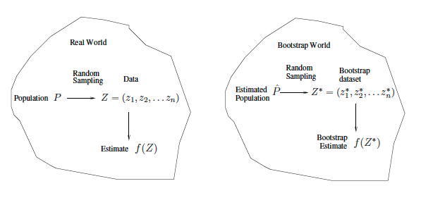 Left: A histogram of the estimates of $\alpha$ obtained by generating 1,000 simulated data sets from the true population. Center: A histogram of the estimates of $\alpha$ obtained from 1,000 bootstrap samples from a single data set. Right: The estimates of $\alpha$ displayed in the left and center panels are shown as boxplots. In each panel, the pink line indicates the true value of $\alpha$. ::: ## Bootstrap in general ::: {#fig-bootstrap-general-pic}{width=500px}