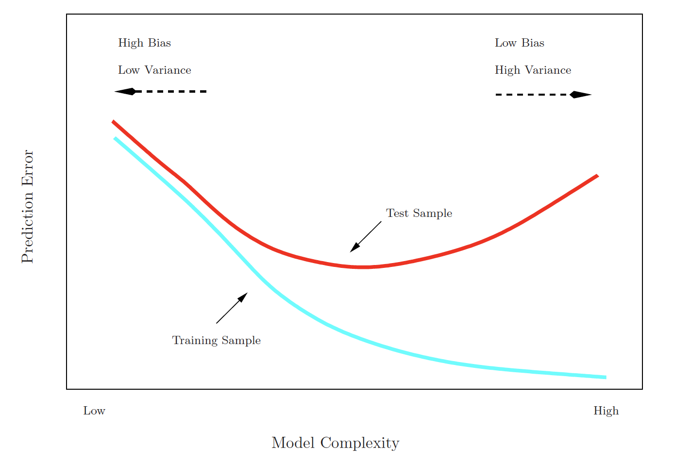 Blue: true test MSE. Black dashed line: LOOCV estimate of test MSE. Orange: 10-fold CV estimate of test MSE. The crosses indicate the minimum of each of the MSE curves. [Left data](https://ucla-biostat-212a.github.io/2026winter/slides/02-statlearn/statlearn.html#fig-tradeoff-truth). [Middle data](https://ucla-biostat-212a.github.io/2026winter/slides/02-statlearn/statlearn.html#fig-tradeoff-smooth-truth). [Right data](https://ucla-biostat-212a.github.io/2026winter/slides/02-statlearn/statlearn.html#fig-tradeoff-wiggly-truth). ::: ## Bias-variance tradeoff for cross-validation - Since each training set is only $(K - 1) / K$ as big as the original training set, the estimates of prediction error will typically be biased upward. (Why?) - This bias is minimized when $K = n$ (LOOCV), but this estimate has high variance, as noted earlier. - $K = 5$ or $10$ provides a good compromise for this bias-variance trade-off. ## Cross-validation for classification problems - We divide the data into $K$ roughly equal-sized parts $C_1, C_2, \ldots, C_K$. $C_k$ denotes the indices of the observations in part $k$. There are $n_k$ observations in part $k$. If $n$ is a multiple of $K$, then $n_k = n / K$. - Compute $$ \text{CV}_k = \sum_{k=1}^K \frac{n_k}{n} \text{Err}_k, $$ where $$ \text{Err}_k = \frac{1}{n_k} \sum_{i \in C_k} I(y_i \ne \hat y_i). $$ - The estimated standard deviation of $\text{CV}_k$ is $$ \hat{\text{SE}}(\text{CV}_k) = \sqrt{\frac{1}{K} \sum_{k=1}^K \frac{(\text{Err}_k - \bar{\text{Err}_k})^2}{K-1}}. $$ This is a useful estimate, but strictly speaking, not quite valid. ## Bootstrap - The bootstrap is a flexible and powerful statistical tool that can be used to quantify the uncertainty associated with a given estimator or learning method. - For example, it can provide an estimate of the standard error of a coefficient, or a confidence interval for that coefficient. - A simple example. - Suppose that we wish to invest a fixed sum of money in two financial assets that yield returns of $X$ and $Y$, respectively, where $X$ and $Y$ are random quantities. - We will invest a fraction $\alpha$ of our money in $X$, and will invest the remaining $1 - \alpha$ in $Y$. - We wish to choose $\alpha$ to minimize the total risk, or variance, of our investment. In other words, we want to minimize $\operatorname{Var}(\alpha X + (1 - \alpha) Y)$. - One can show that the value that minimizes the risk is given by $$ \alpha = \frac{\sigma_{Y}^2 - \sigma_{XY}}{\sigma_X^2 + \sigma_Y^2 - 2 \sigma_{XY}}, $$ where $\sigma_X^2 = \operatorname{Var}(X)$, $\sigma_Y^2 = \operatorname{Var}(Y)$, and $\sigma_{XY} = \operatorname{Cov}(X, Y)$. - But the values of $\sigma_X^2$, $\sigma_Y^2$, and $\sigma_{XY}$ are unknown. - We can compute estimates for these quantities $\hat{\sigma}_X^2$, $\hat{\sigma}_Y^2$, and $\hat{\sigma}_{XY}$, using a data set that contains measurements for $X$ and $Y$. - We can then estimate the value of $\alpha$ that minimizes the variance of our investment using $$ \hat{\alpha} = \frac{\hat{\sigma}_{Y}^2 - \hat{\sigma}_{XY}}{\hat{\sigma}_X^2 + \hat{\sigma}_Y^2 - 2 \hat{\sigma}_{XY}}. $$ ::: {#fig-unrealistic-toy}{width=600px height=600px}