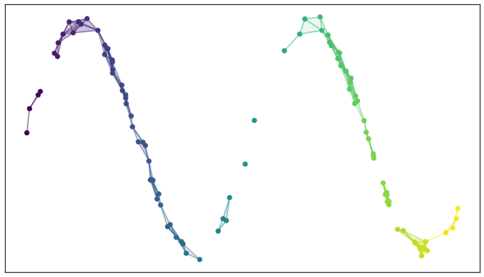 Left: a scree plot depicting the proportion of variance explained by each of the four principal components in the `USArrests` data. Right: the cu- mulative proportion of variance explained by the four principal components in the `USArrests` data. ::: - The **scree plot** on the previous slide can be used as a guide: we look for an **elbow**. ## UMAP ### Rescourses - [UMAP: Uniform Manifold Approximation and Projection for Dimension Reduction](https://arxiv.org/abs/1802.03426) - [Understanding UMAP](https://pair-code.github.io/understanding-umap/) - [Nature NEWS 23 February 2024: ‘All of Us’ genetics chart stirs unease over controversial depiction of race](https://www.nature.com/articles/d41586-024-00568-w) - [How UMAP Works](https://umap-learn.readthedocs.io/en/latest/how_umap_works.html) ### Goal of UMAP - PCA works the best if the first 2 PC explain the most variance. - UMAP is a general purpose manifold learning and **dimension reduction** algorithm, usually high-dimensional. - UMAP is flexible in various data types, not just numerical data but also categorical or mixed datasets. - Efficiency and Scalability: UMAP is designed to be efficient with both time and memory usage, making it capable of handling large datasets more feasibly than some other dimensionality reduction methods. - Easy to use and easy to be integrated into data analysis workflows. ### Examples - `USArrests` data ```{r} (USArrests <- rownames_to_column(USArrests, var = "State") %>% as_tibble()) ``` ```{r} set.seed(211) umap_rec <- recipe(~., data = USArrests) %>% update_role(State, new_role = "id") %>% step_normalize(all_predictors()) %>% step_umap(all_predictors(), neighbors = 10, num_comp = 2, min_dist = 0.01) umap_prep <- prep(umap_rec) Assault = umap_prep$template %>% merge(USArrests, by = "State") %>% pull(Assault) juice(umap_prep) %>% ggplot(aes(UMAP1, UMAP2, label = State, color = Assault)) + geom_point( alpha = 0.7, size = 2) + geom_text(check_overlap = TRUE, hjust = "inward") + labs(color = "Assualt") ``` - MNIST and Fashion MNIST ```{r} # may take sometime fashion_mnist <- dataset_fashion_mnist() mnist <- dataset_mnist() ``` ```{r} # c(train_images, train_labels) %<-% fashion_mnist$train # c(test_images, test_labels) %<-% fashion_mnist$test c(train_images, train_labels) %<-% mnist$train c(test_images, test_labels) %<-% mnist$test ``` ```{r} sample_image <- tibble() for(i in 1:20){ image <- as.data.frame(train_images[i, , ]) colnames(image) <- seq_len(ncol(image)) image <- image %>% mutate(y = seq_len(nrow(image))) image <- gather(image, "x", "value", -y) image <- image %>% as_tibble() %>% mutate(x = as.integer(x), l = paste(i, ": ", as.character(train_labels[i]), sep = "")) sample_image <- bind_rows(sample_image, image) } p <- ggplot(sample_image, aes(x = x, y = y, fill = value)) + geom_tile() + scale_fill_gradient(low = "white", high = "black", na.value = NA) + scale_y_reverse() + theme_minimal() + theme(panel.grid = element_blank()) + theme(aspect.ratio = 1) + xlab("") + ylab("") + facet_wrap(~l, ncol = 5) print(p) ``` #### PCA ```{r} train_images <- array_reshape(train_images, c(nrow(train_images), 784)) train_images <- train_images / 255 set.seed(211) n = 1000 labels = as.factor(train_labels[1:n]) ``` ```{r} pca_rec <- recipe(~., data = train_images[1:n, ]) %>% step_zv(all_numeric_predictors()) %>% step_normalize(all_predictors()) %>% step_pca(all_predictors()) pca_prep <- prep(pca_rec) pca_prep ``` ```{r} juice(pca_prep) %>% ggplot(aes(PC1, PC2, label = labels)) + geom_point(aes(color = labels), alpha = 0.7, size = 2) + #geom_text(check_overlap = TRUE, hjust = "inward") + labs(color = NULL) ``` #### UMAP ```{r} umap_rec <- recipe(~., data = train_images[1:n, ]) %>% # update_role(State, new_role = "id") %>% step_zv(all_numeric_predictors()) %>% step_normalize(all_predictors()) %>% step_umap(all_predictors(), neighbors = 20, num_comp = 3, min_dist = 0.02) umap_prep <- prep(umap_rec) juice(umap_prep) %>% ggplot(aes(UMAP1, UMAP2, label = labels, color = labels)) + geom_point( alpha = 0.7, size = 2) + geom_text(check_overlap = TRUE, hjust = "inward") ``` ### A brief introduction to UMAP theory [Fashion-MNIST](https://github.com/zalandoresearch/fashion-mnist)  - First, UMAP constructs a high dimensional graph representation of the data using fuzzy simplicial complex: + a representation of a weighted graph, with edge weights representing the likelihood that two points are connected ::: {#fig-simplex}  [Low dimensional simplices](https://umap-learn.readthedocs.io/en/latest/how_umap_works.html#id2) ::: - To determine connectedness, UMAP extends a radius outwards from each point, connecting points when those radii overlap. For example, consider a test dataset like this ::: {#fig-sine-wave}  [Test data set of a noisy sine wave](https://umap-learn.readthedocs.io/en/latest/how_umap_works.html#id3) ::: - Then the result is something like this ::: {#fig-open-cover}  [A basic open cover of the test data](https://umap-learn.readthedocs.io/en/latest/how_umap_works.html#id4) ::: - We can then depict the the simplicial complex of 0-, 1-, and 2-simplices as points, lines, and triangles. ::: {#fig-open-cover}  [A simplicial complex built from the test data](https://umap-learn.readthedocs.io/en/latest/how_umap_works.html#id5) ::: - Choosing this radius is critical - too small a choice will lead to small, isolated clusters, while too large a choice will connect everything together. - UMAP overcomes this challenge by choosing a radius locally, based on the distance to each point's nth nearest neighbor, i.e., `n_neighbors`. - UMAP then makes the graph "fuzzy" by decreasing the likelihood of connection as the radius grows. - By stipulating that each point must be connected to at least its closest neighbor, UMAP ensures that local structure is preserved in balance with global structure. - Then, UMAP optimizes a low-dimensional graph to be as structurally similar as possible by controlling the number of edges and their weights