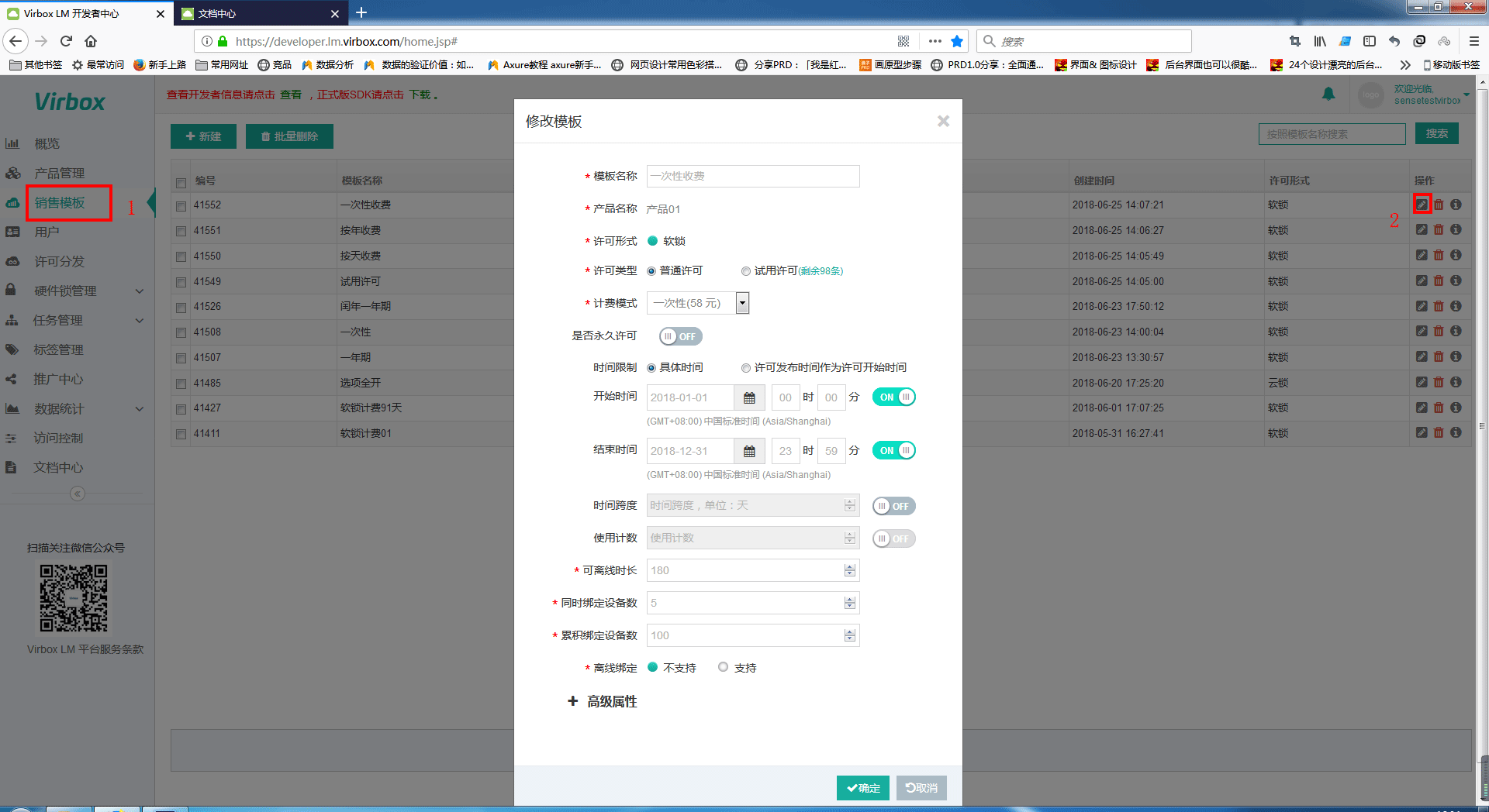 - 许可类型和计费模式在发布许可时默认不可更改。如想修改,在高级属性中,勾选基于此模板,发布许可时是否可临时修改模板限制。如图