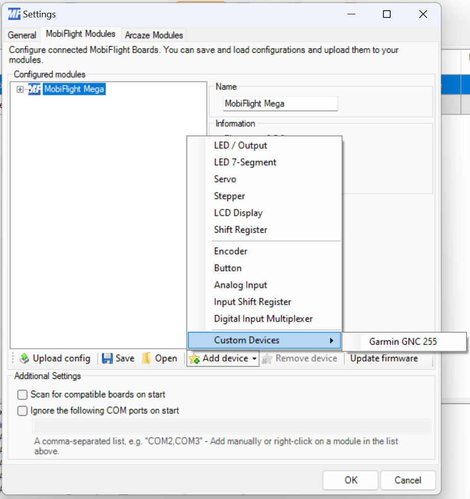 Custom devices are a new type of supported device which allows the MobiFlight Community to extend the capabilities of the MobiFlight boards.