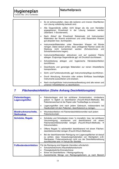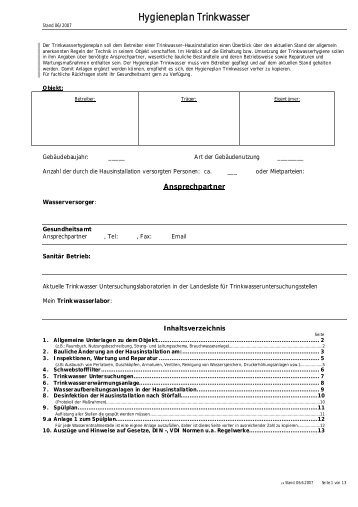 Im Musterhygieneplan werden allgemeine Grundlagen genannt, die als nützliche Hilfe bei der Erstellung des individuellen Hygieneplanes dienen können. Der Hygieneplan muss hinsichtlich seiner Aktualität regelmäßig überprüft und ggf. verändert oder ergänzt werden und auf organisatorische und baulich-funktionelle Gegebenheiten der Einrichtung. Hilfe bei der Erstellung von Hygieneplänen zur Dokumentation der die innerbetrieblichen Verfahrensweisen zur Infektionshygiene.