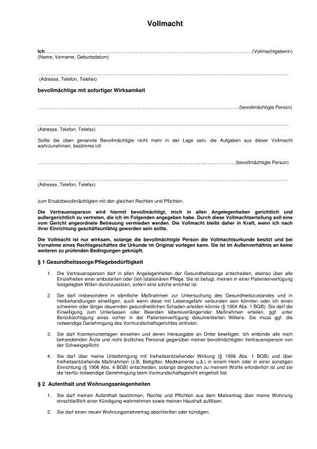 Mit einer Vorsorgevollmacht bevollmächtigt nach deutschem Recht eine Person eine andere Person, im Falle einer Notsituation alle oder bestimmte Aufgaben für den Vollmachtgeber zu erledigen. Das Muster muss lediglich ausgefüllt und. JJJJ Wichtig ist in diesem Fall, dass die Vorsorgevollmacht rechtzeitig erstellt wird, da die.