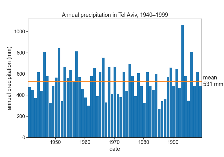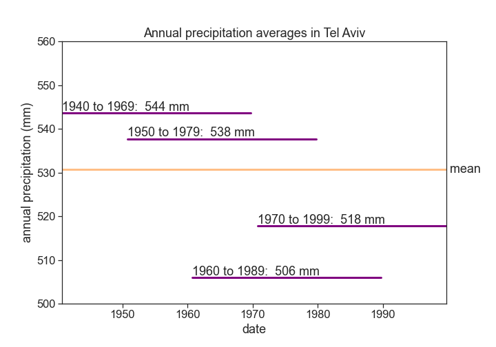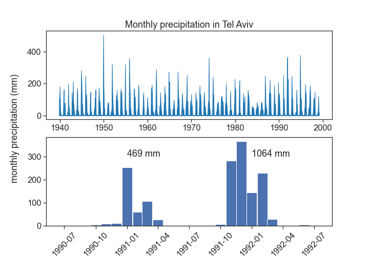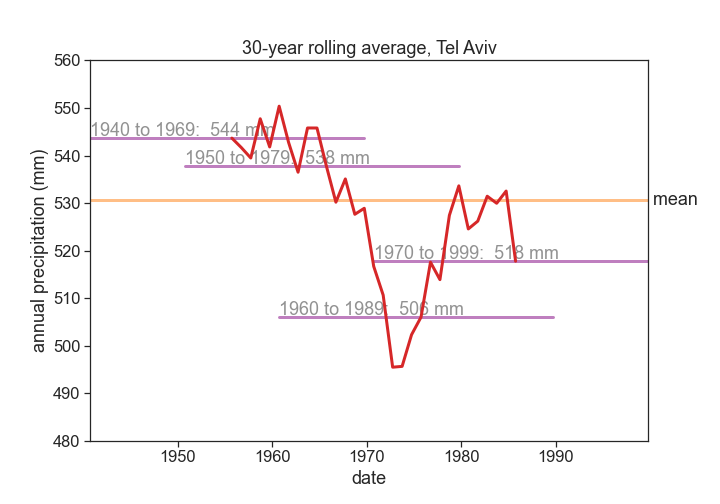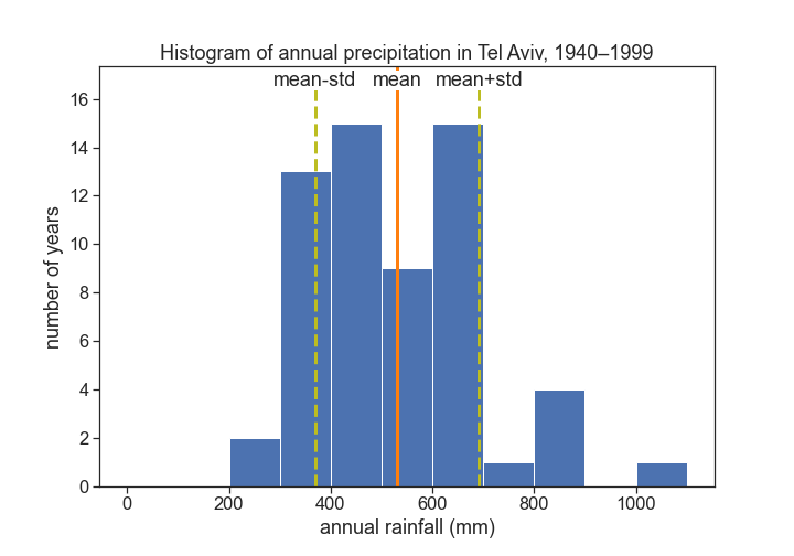 { "cells": [ { "cell_type": "markdown", "metadata": {}, "source": [ "# Interannual variability of precipitation\n", "> every year something new\n", "\n", "- toc: true \n", "- badges: true\n", "- comments: false\n", "- categories: [jupyter]" ] }, { "cell_type": "markdown", "metadata": {}, "source": [ "\n", "\n", "## hydrological year\n", "\n", "A time period of 12 months for which precipitation totals are measured. The hydrological year is designated by the calendar year in which it **ends**. \n", "Let's define the hydrological year for Tel Aviv from 1 October to 30 September.\n", "\n", "האם אקלים הגשם שלנו משתנה\n", "> youtube: https://youtu.be/v0uNpj03Rk4\n", "\n", "\n", "\n", "\n", "\n", "## coefficient of variation\n", "\n", "$\\langle{P}\\rangle=$ average precipitation \n", "$\\sigma=$ standard deviation\n", "\n", "$$CV = \\frac{\\sigma}{\\langle{P}\\rangle}$$\n", "\n", "Assuming that the inter-annual distribution is a gaussian: 67% of the time, rainfall will vary +/- 30% from its long term average in Tel Aviv.\n", "\n", "Precipitation averages are [usually calculated for time intervals of 30 years](https://www.ncdc.noaa.gov/news/defining-climate-normals-new-ways).\n", "\n", "\n", "\n", "" ] }, { "cell_type": "code", "execution_count": 3, "metadata": {}, "outputs": [ { "data": { "text/html": [ "\n", "