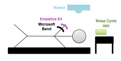"The figure above shows how the data was collected. The Microsoft Kinect was used as a depth camera to record movements throughout the night. The Empatica E4 was placed at the non-dominant wrist and used for accelerometer, blood volume pulse (BVP), temperature, and EDA measurements. The Microsoft Band was also placed on the non-dominant wrist, and was used for its sleep quality assessments. Lastly, an iPhone with the Sleep Cycle app was placed next to the bed, where it used microphone signals to identify movements and output a sleep quality assessment. \n",